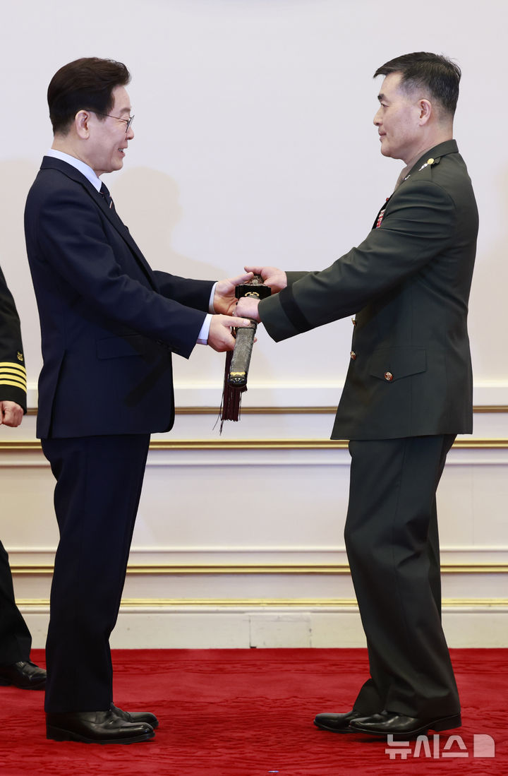 李在明大統領、朴禎勲・国防部調査本部長に三精剣を授与(5/15)