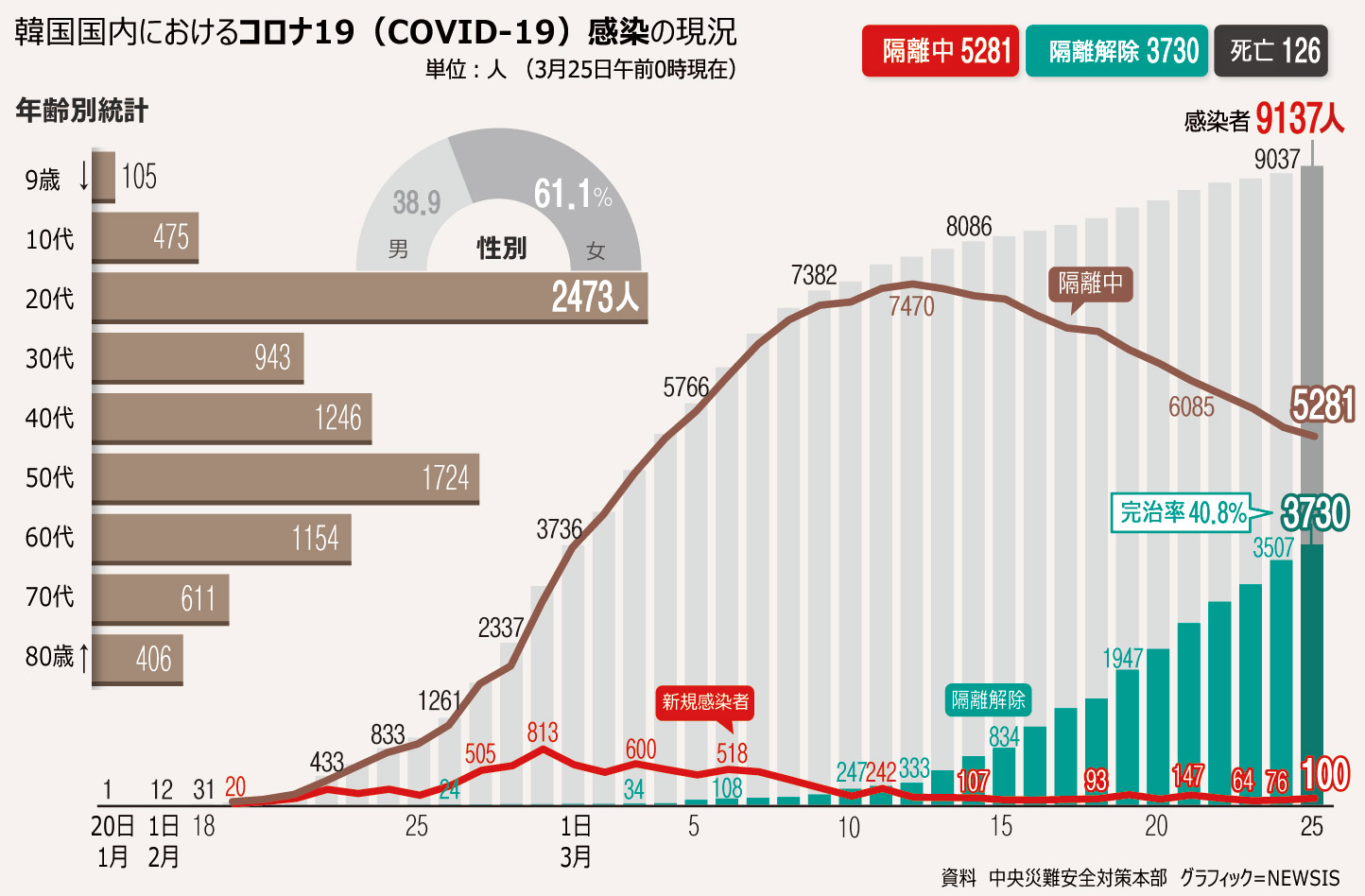 韓国の新型コロナ感染者9137人・完治3730人・死者126人(25日0時)(1/1)