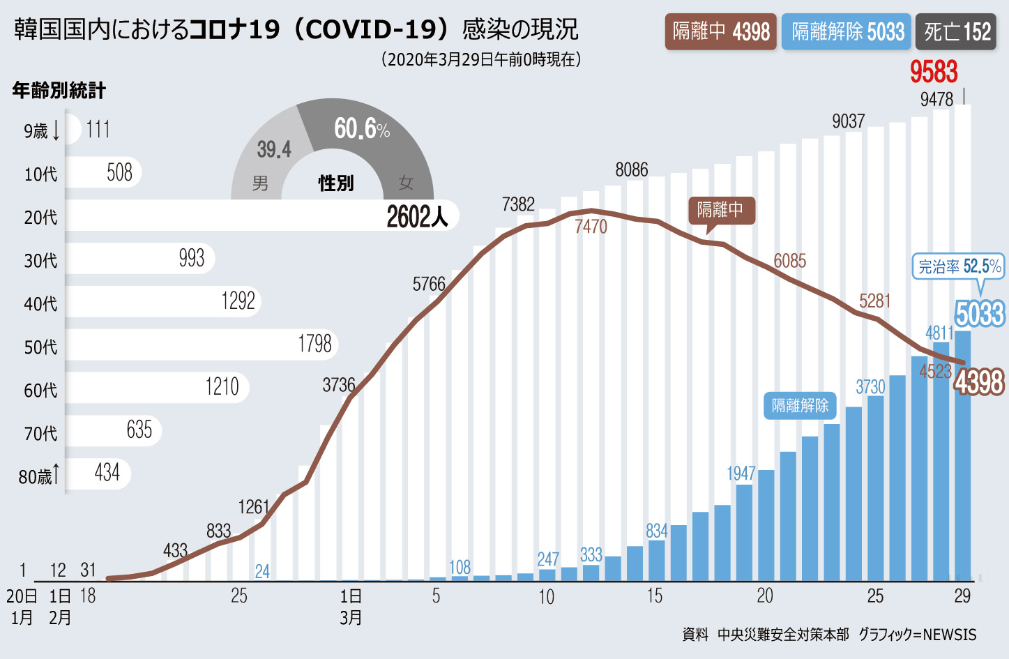 韓国の新型コロナ感染者9583人・完治5033人・死者152人(29日0時)(1/1)
