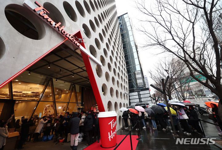 カナダのコーヒーチェーン「Tim Hortons」韓国1号店のグランドオープンを待つ市民(1/11)
